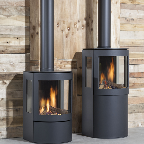 Las llamas magníficas de esta estufa de gas derecha libre son visibles a partir de tres diversos ángulos. La balsa puede ser el centro brillante de cualquier sitio.