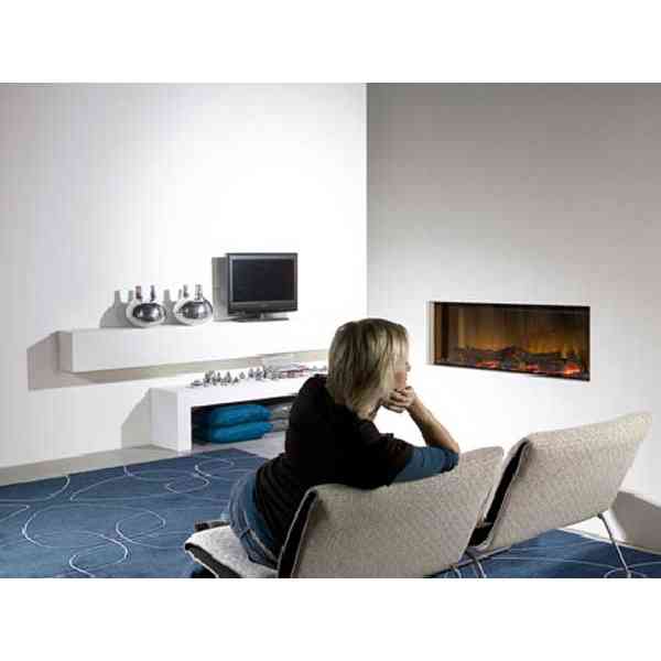 Fuego eléctrico apaisado y sin marco preparado para empotrar, con sistema de luces LED y set de troncos decorativos.