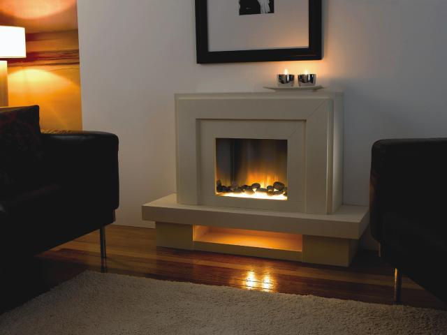 Conjunto Chimenea eléctrica Lazio. Mando a distancia multifunción con regulación de intensidad. Discreto calefactor con dos potencias 750 / 1500 W . Efecto de fuego con piedras. Acabado color piedra Portland.