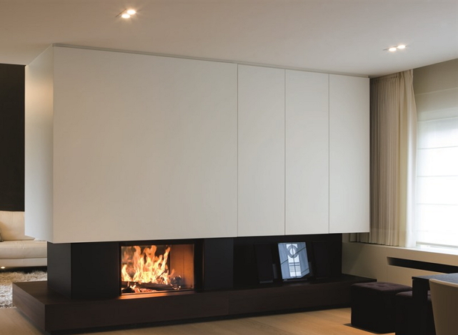Nos encontramos delante de una chimenea cerrada a leña con hogar vermiculita y opcionalmente en acero negro o de fundición con base en vermiculita. Dispone de un exclusivo sistema de apertura vertical con cristal al aire y para facilitar las operaciones de limpieza del cristal, la puerta se puede abrir de forma batiente.