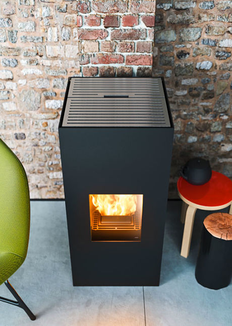 Estufa de pellet sin bocas frontales, realizada con estructura completamente de acero pintado. Brasero de fundición con sistema patentado de arranque seguro. Gestión inteligente de la combustión mediante Active+. De serie, el mando a distancia con función de termostato ambiente.