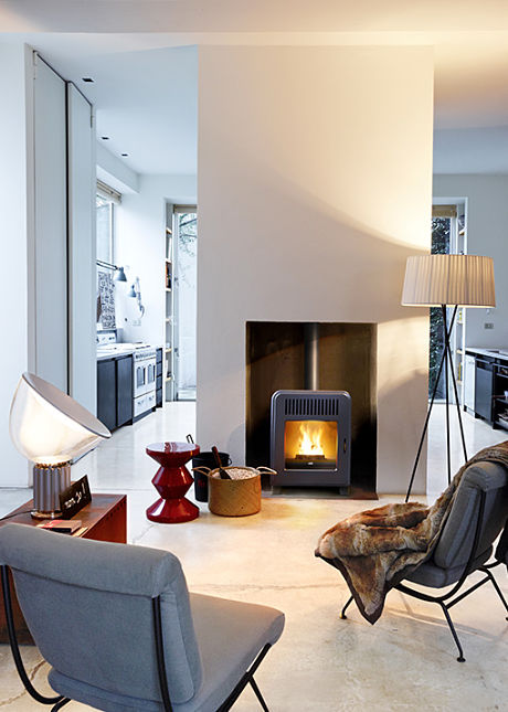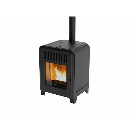 Estufa de pellet de diseño clásico-contemporáneo; tiene un revestimiento en acero pintado de color negro y puerta de fundición. Gracias a la altura reducida (80cm) y a la descarga de humos superior, esta estufa puede colocarse fácilmente en viviendas en las que ya exista salida de humos.
