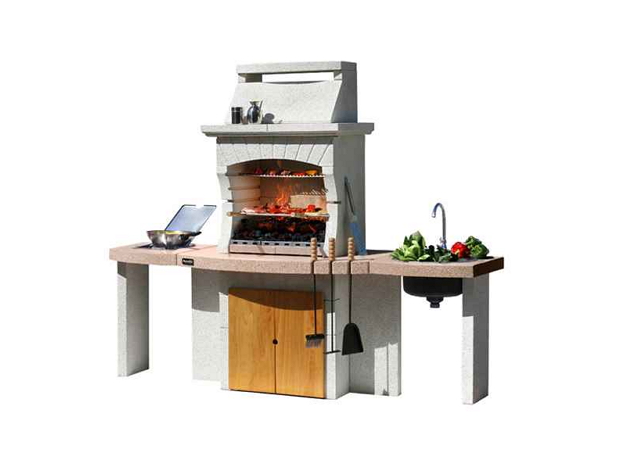 Barbacoa de colores naturales construida en granulado de piedra con materiales de alta resistencia térmica. La estructura es de color «Blanco Carrara» mientras que la encimera es de color «Rosa Asiago», con acabado pulido Crystal y equipada con orificios porta útiles.